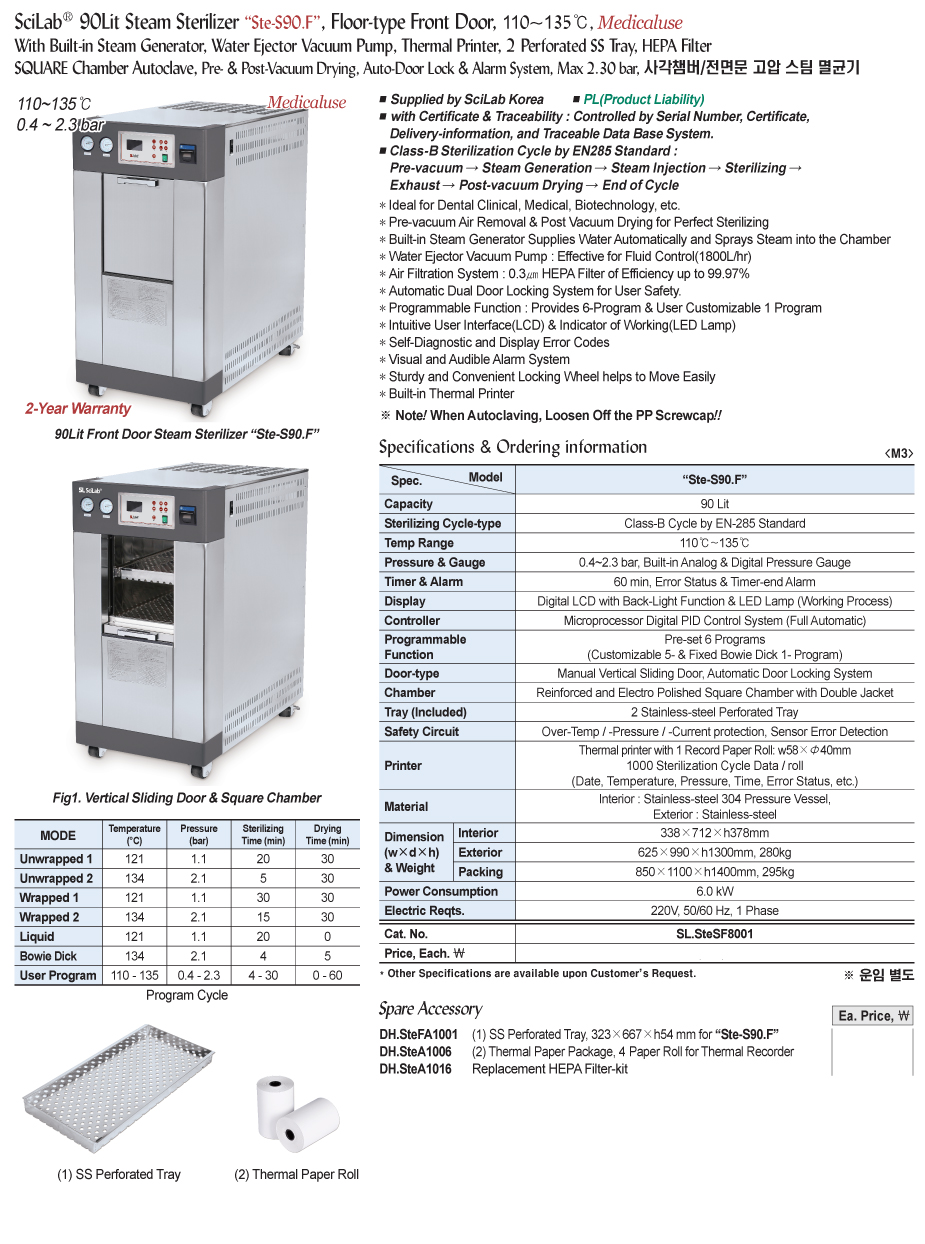 SciLab® 90Lit Steam Sterilizer “Ste-S90.F”, Floor-type Front Door, 110~135℃, Medicaluse With Built-in Steam Generator, Water Ejector Vacuum Pump, Thermal Printer, 2 Perforated SS Tray, HEPA Filter SQUARE Chamber Autoclave, Pre- & Post-Vacuum Drying, Auto-Door Lock & Alarm System, Max 2.30 bar, 사각챔버/전면문 고압 스팀 멸균기